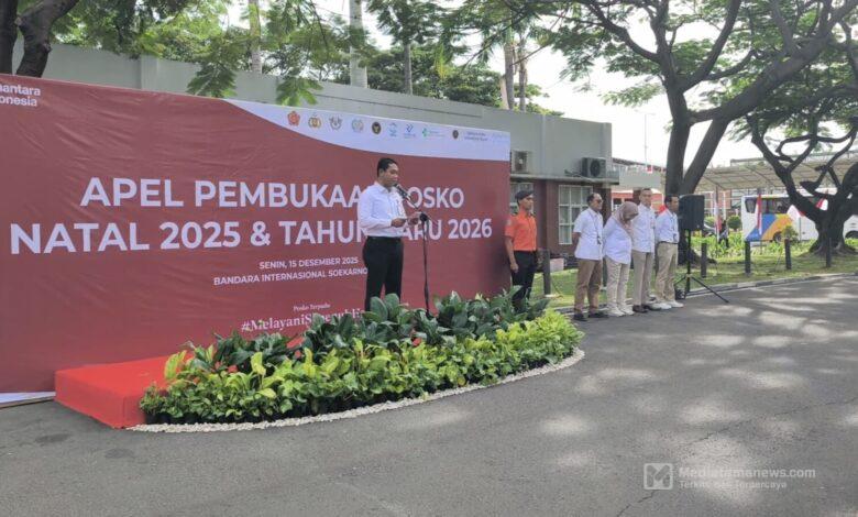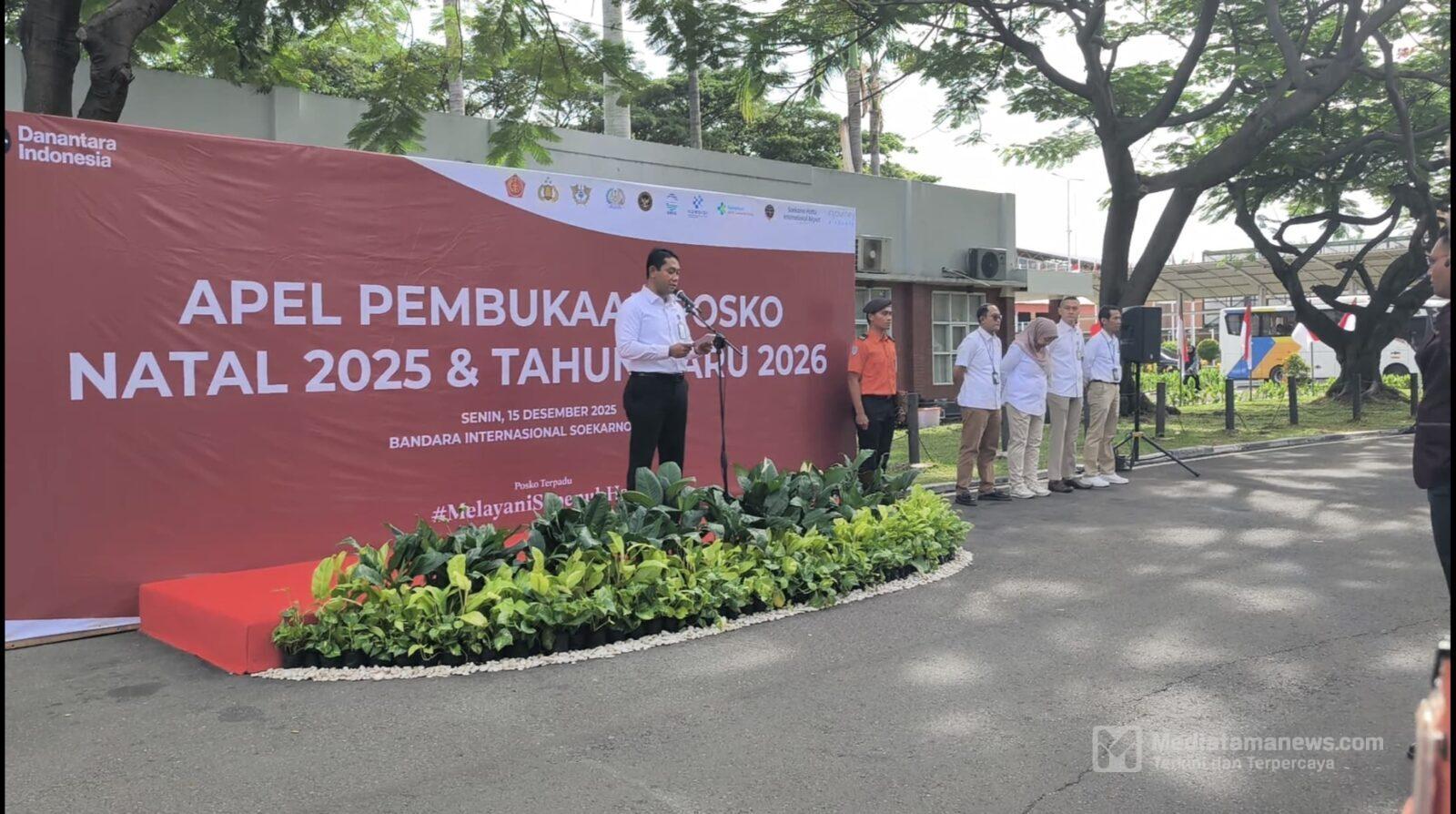 Mediatamanews | Tangerang – Jelang Natal dan tahun Baru Bandara Soekarno – Hatta menggelar apel pasukan personil bandara di Posko angkutan Natal dan Tahun Baru 2025/2026. dengan melibatkan Aviation Security dan stakeholder Terminal dalam menyiagakan keamanan selama periode libur Natal dan Tahun Baru demi melayani kenyamanan penumpang selama musim libur. Senin Pagi ( 15/12/2025 ). Adapun keamanan akan disiagakan mulai dari arus lalu lintas di bandara hingga pelayanan penumpang di area counter check in pesawat.