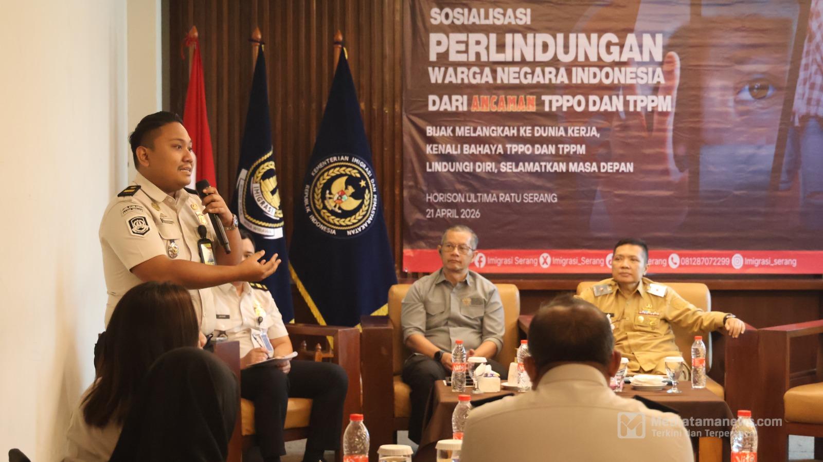 Mediatamanews|Serang (Banten) – Kantor Imigrasi Kelas I Non TPI Serang menggelar kegiatan sosialisasi perlindungan Warga Negara Indonesia (WNI) dengan tema “Bijak Melangkah ke Dunia Kerja, Kenali Bahaya TPPO dan TPPM, Lindungi Diri, Selamatkan Masa Depan” di Hotel Horison Ultima Ratu, Kota Serang, Selasa (21/4).