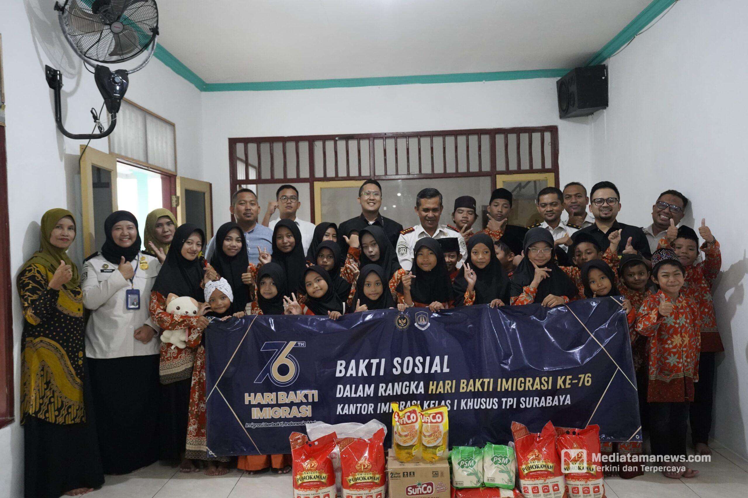 Kepala Kantor Imigrasi Kelas I Khusus TPI Surabaya, Agus Winarto berbagi ceria saat foto bersama Anak-Anak Yatim Piatu/ist.