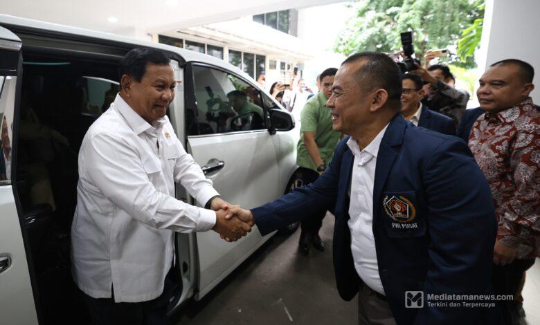 Prabowo hadir memenuhi undangan PWI pada pukul 13:00 WIB tiba di Gedung Dewan Pers disambut oleh Ketua Umum PWI Pusat Hendry Ch Bangun dan jajaran.