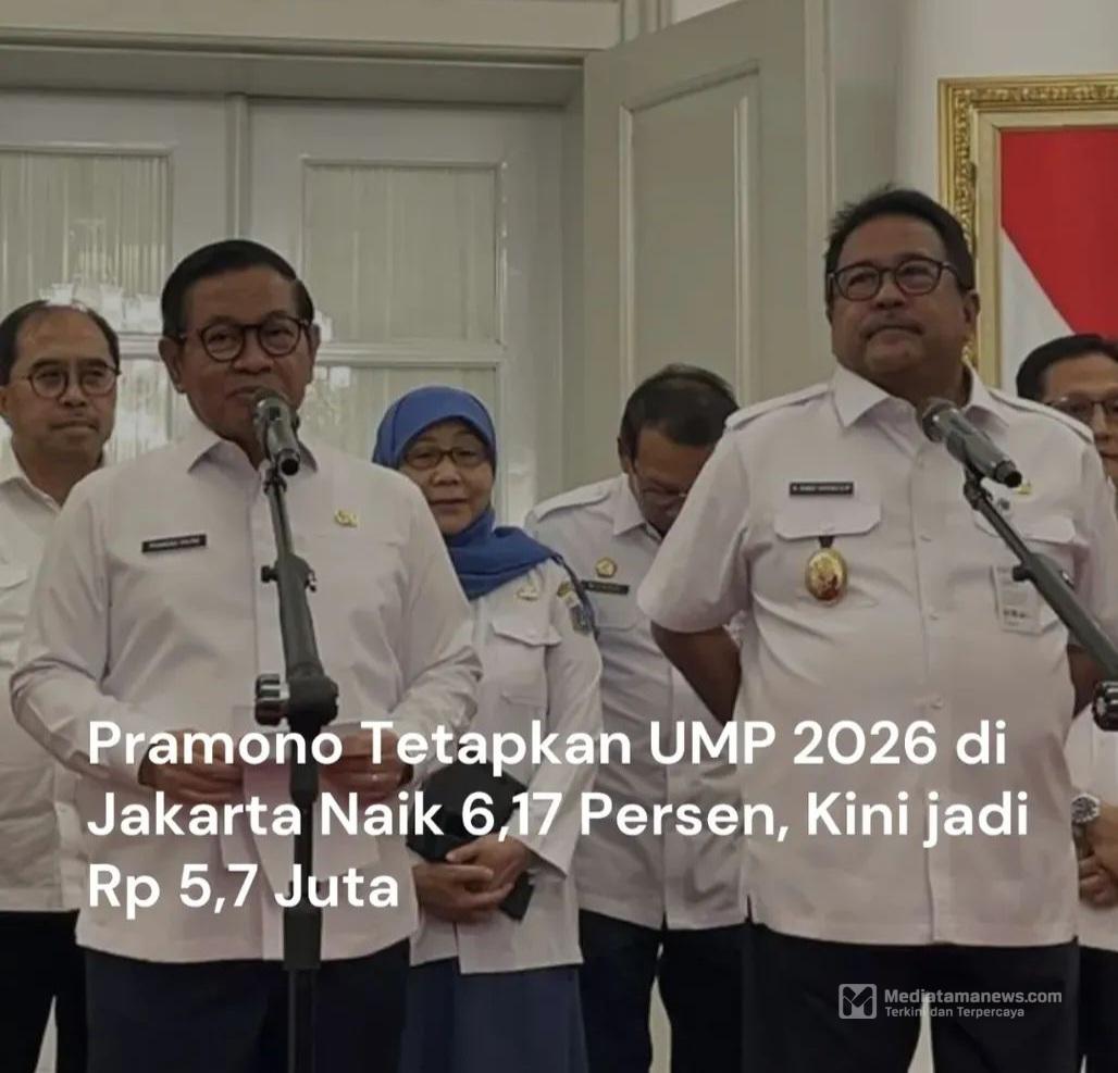 Mediatamanews | Jakarta – Pemerintah Provinsi (Pemprov) DKI Jakarta mengumumkan penetapan Upah Minimum Provinsi (UMP) tahun 2026 sebesar Rp 5.729.876. Angka tersebut naik 6,17 persen dari besaran upah tahun sebelumnya, sebesar Rp 5.396.761.