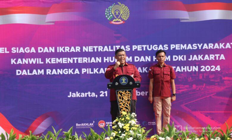 Mediatamanews|Jakarta – Rumah Tahanan Negara (Rutan) Kelas I Cipinang menjadi pusat pelaksanaan Apel Siaga dan Ikrar Netralitas bagi petugas pemasyarakatan di lingkungan Kanwil Kementerian Hukum dan HAM DKI Jakarta, Kamis (21/11). Kegiatan ini melibatkan seluruh jajaran petugas pemasyarakatan di wilayah DKI Jakarta sebagai wujud nyata komitmen menjaga profesionalisme dan netralitas, khususnya dalam menghadapi Pilkada DKI Jakarta Tahun 2024.